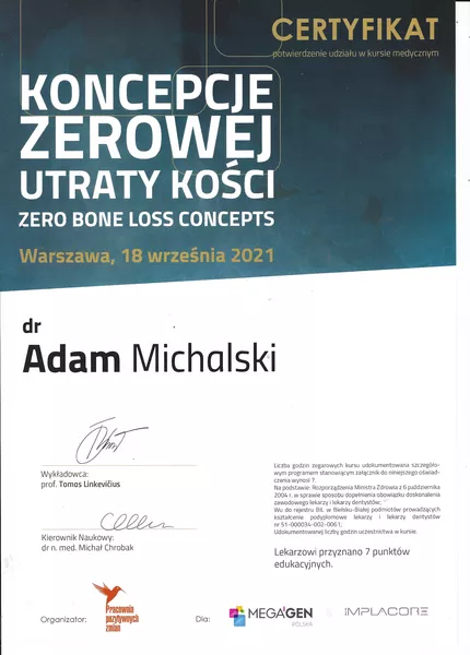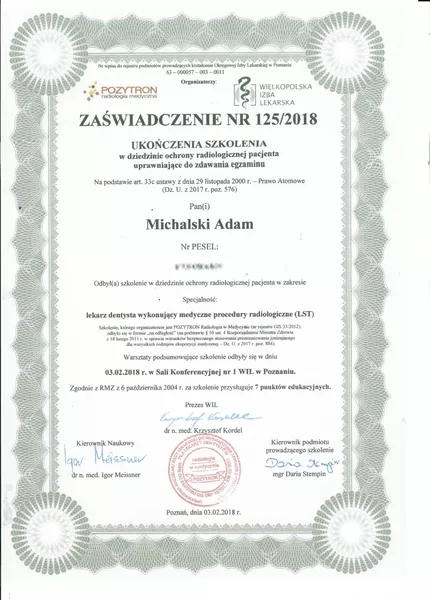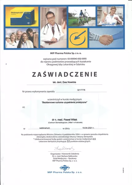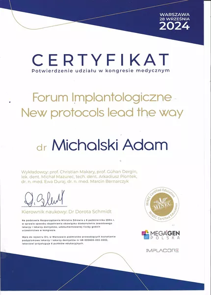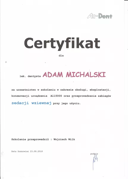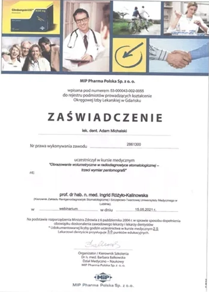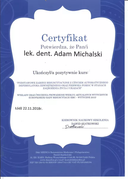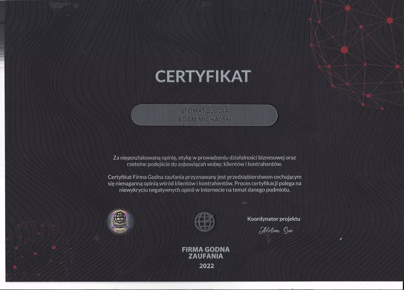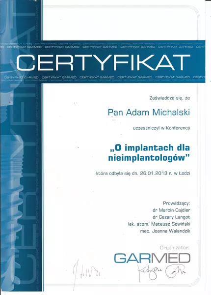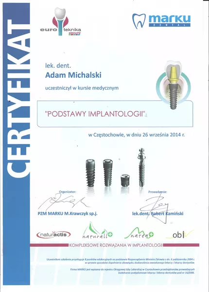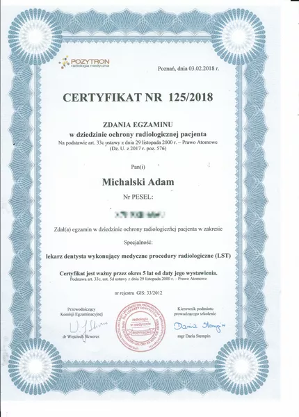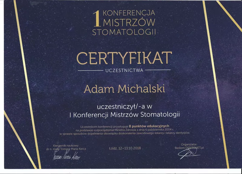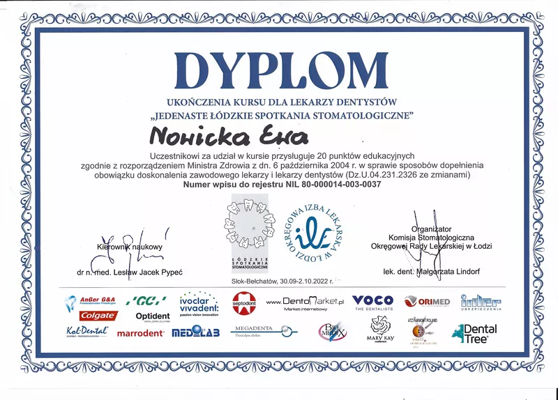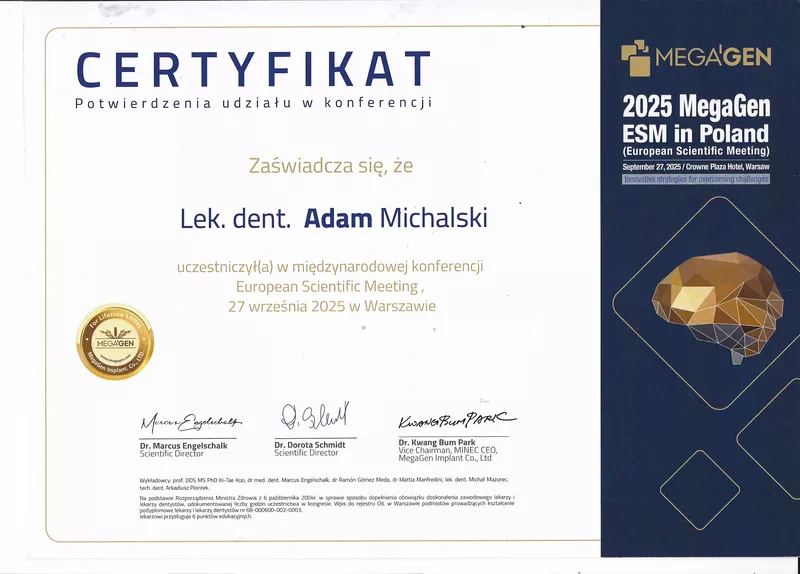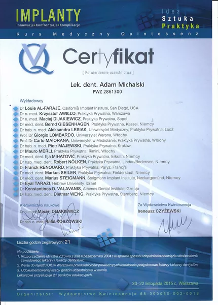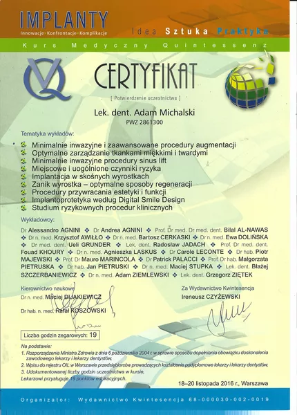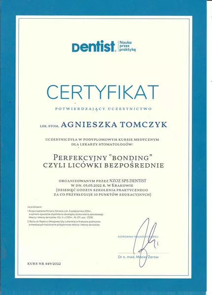 W zakładce Certyfikaty prezentujemy dokumenty potwierdzające kwalifikacje oraz nieustanny rozwój naszych specjalistów. Każdy z nich jest dowodem zaangażowania w doskonalenie umiejętności i poszerzanie wiedzy z zakresu nowoczesnej stomatologii, aby zapewniać Pacjentom opiekę na najwyższym poziomie.