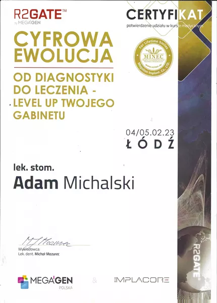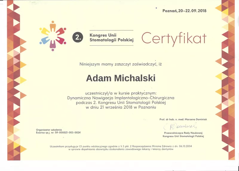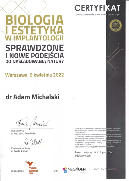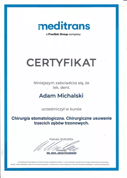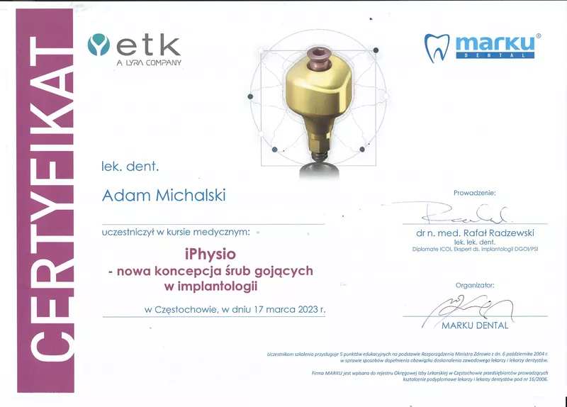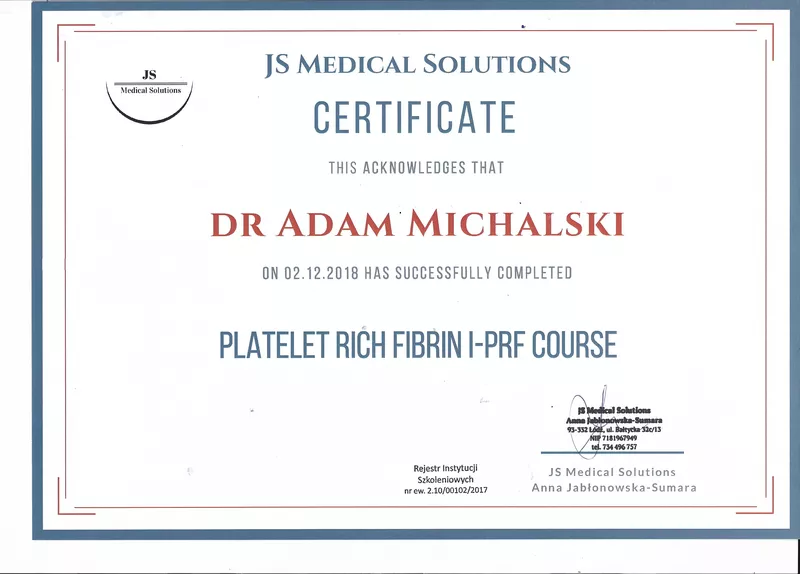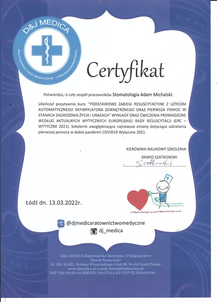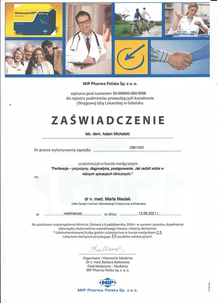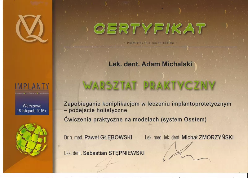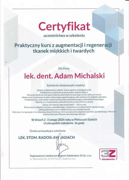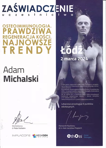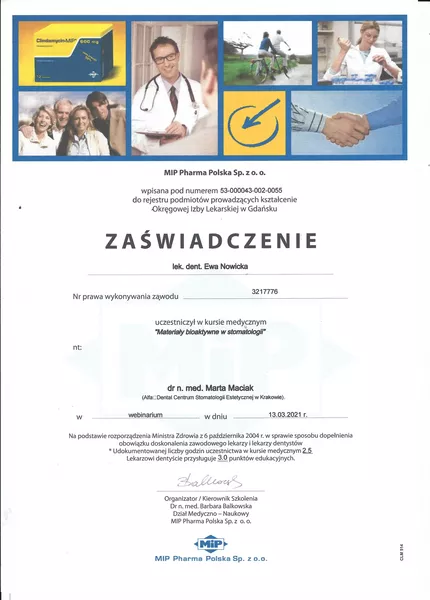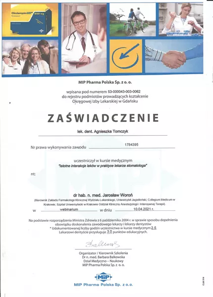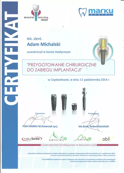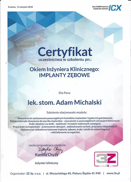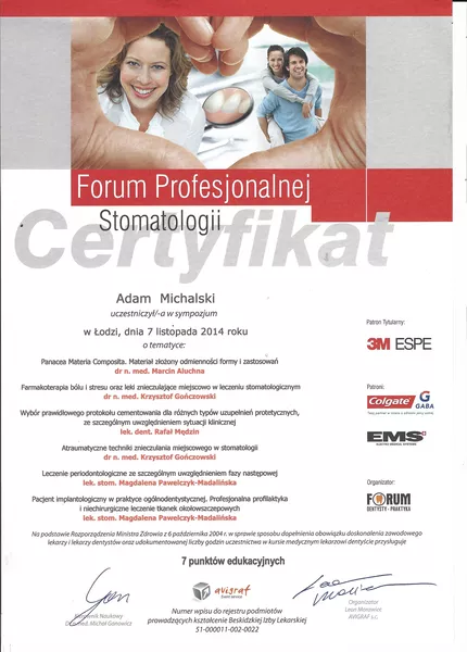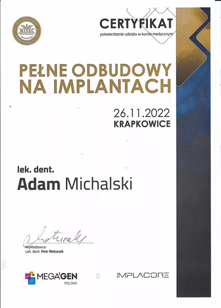 W zakładce Certyfikaty prezentujemy dokumenty potwierdzające kwalifikacje oraz nieustanny rozwój naszych specjalistów. Każdy z nich jest dowodem zaangażowania w doskonalenie umiejętności i poszerzanie wiedzy z zakresu nowoczesnej stomatologii, aby zapewniać Pacjentom opiekę na najwyższym poziomie.