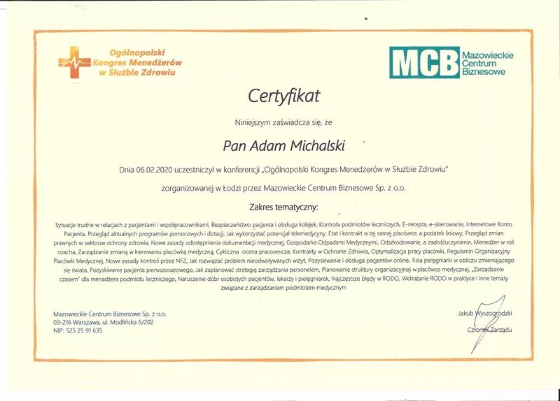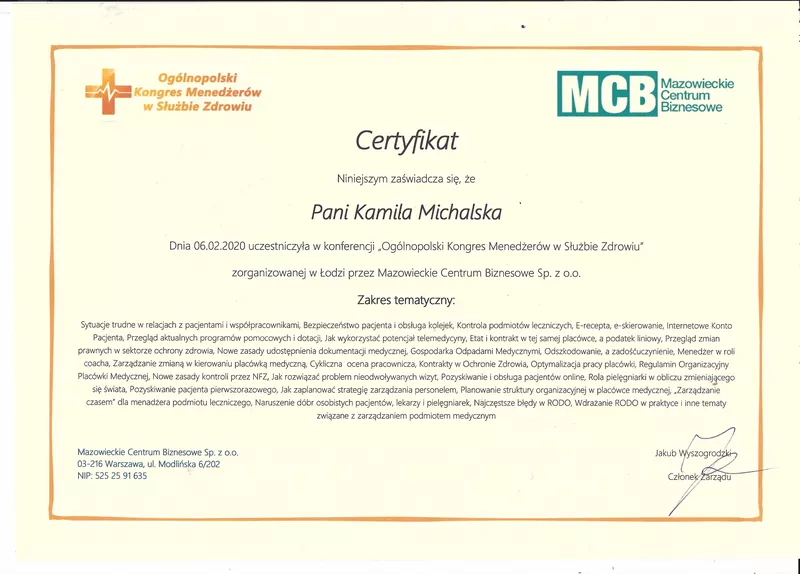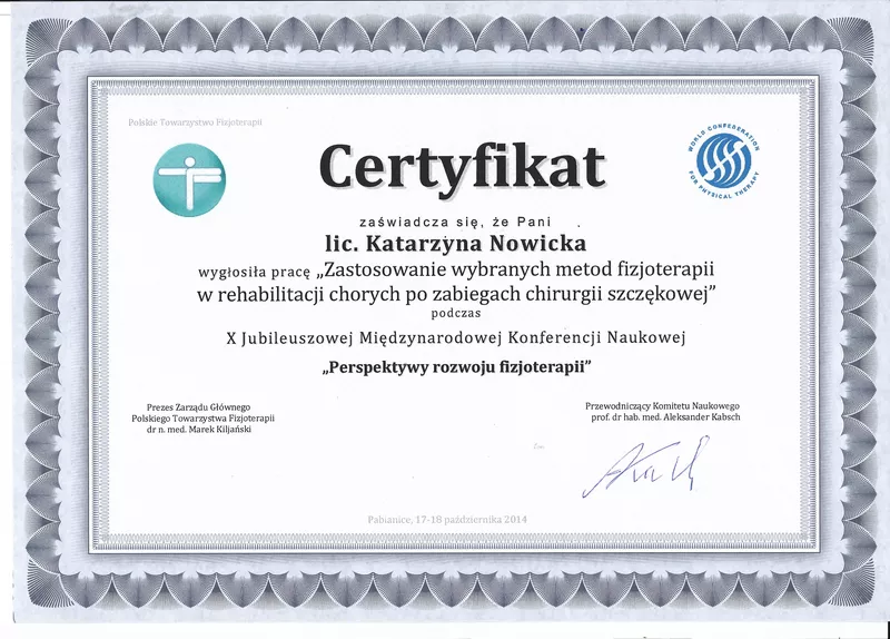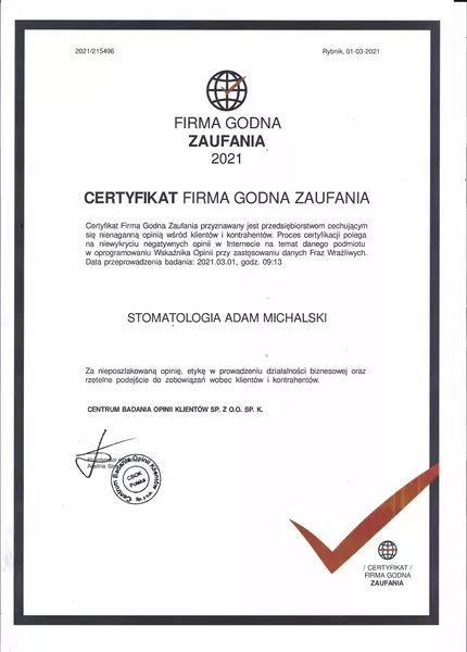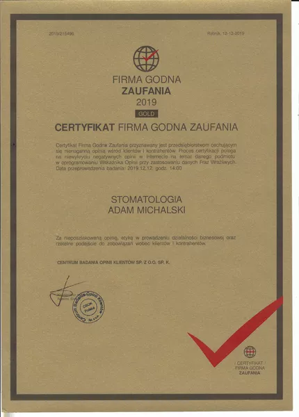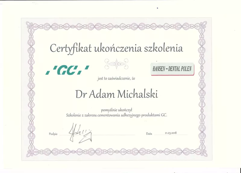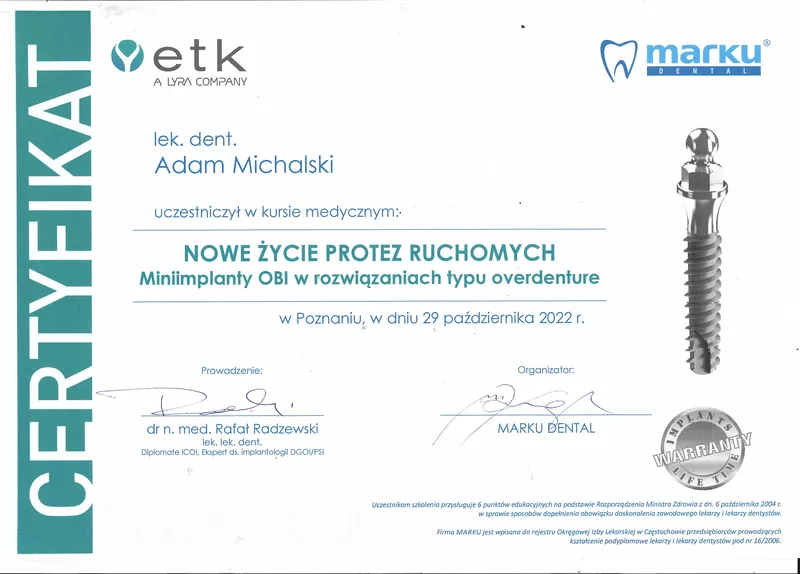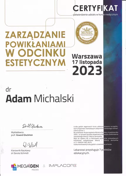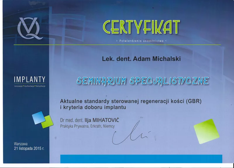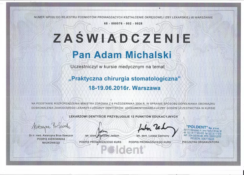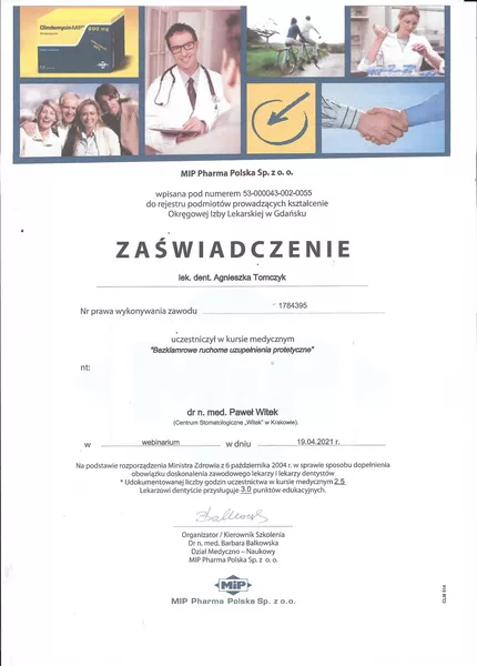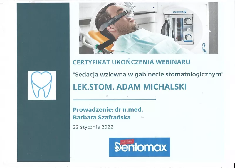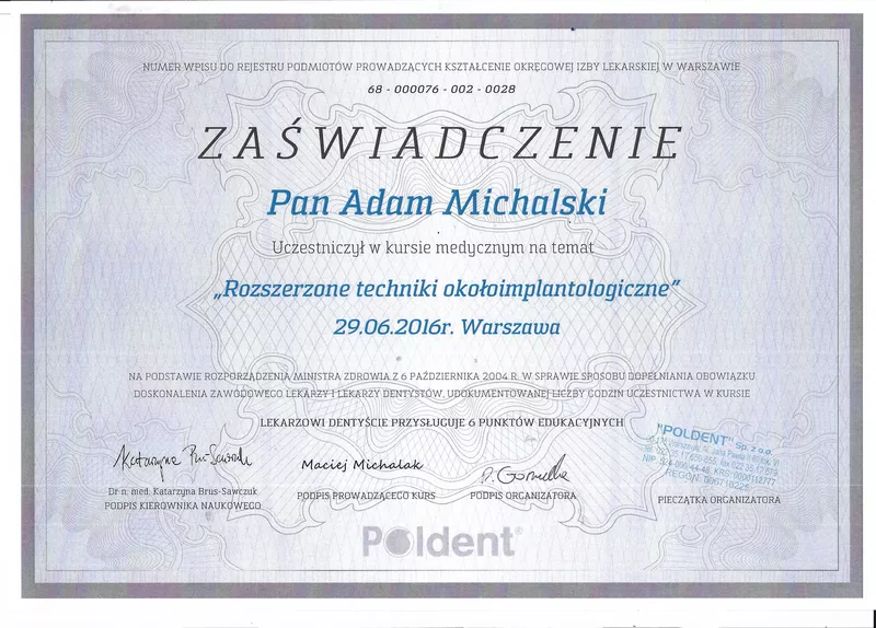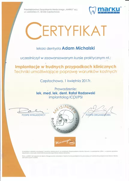 W zakładce Certyfikaty prezentujemy dokumenty potwierdzające kwalifikacje oraz nieustanny rozwój naszych specjalistów. Każdy z nich jest dowodem zaangażowania w doskonalenie umiejętności i poszerzanie wiedzy z zakresu nowoczesnej stomatologii, aby zapewniać Pacjentom opiekę na najwyższym poziomie.